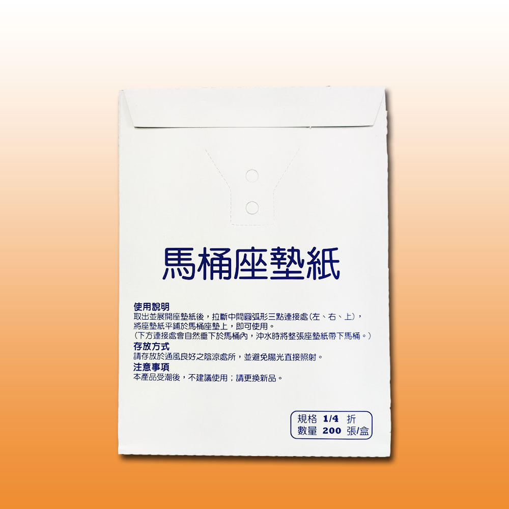 ■外盒尺寸 : 205 (寬) x 263 (高) x 30 (深) mm ■產品重量 : 約 450 g /盒 ■產品容量 : 200 張 /盒, 4800張/箱 ■紙張特性 : 1/4 折馬桶專用座墊紙 ■包 裝 : 24 盒/箱