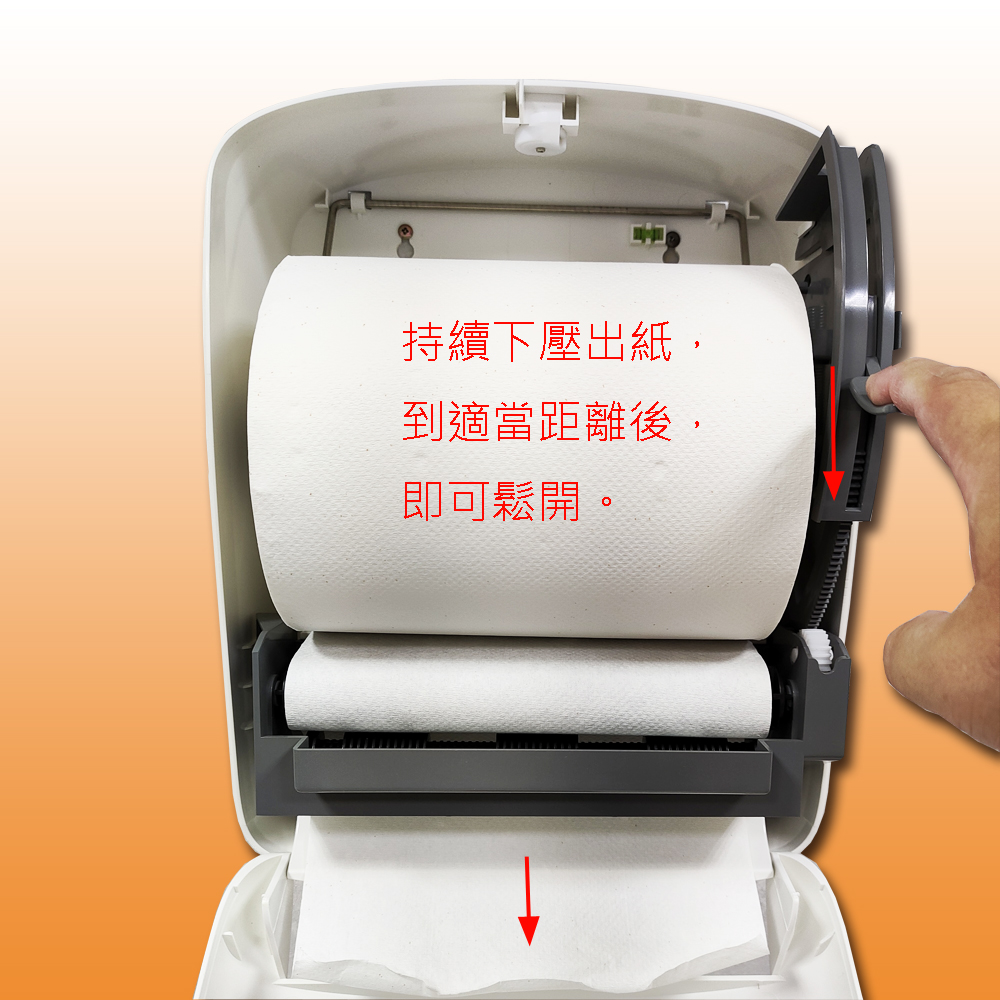 ※出紙 : 需要用紙時,將右側的壓板向下壓到底,即可出紙。